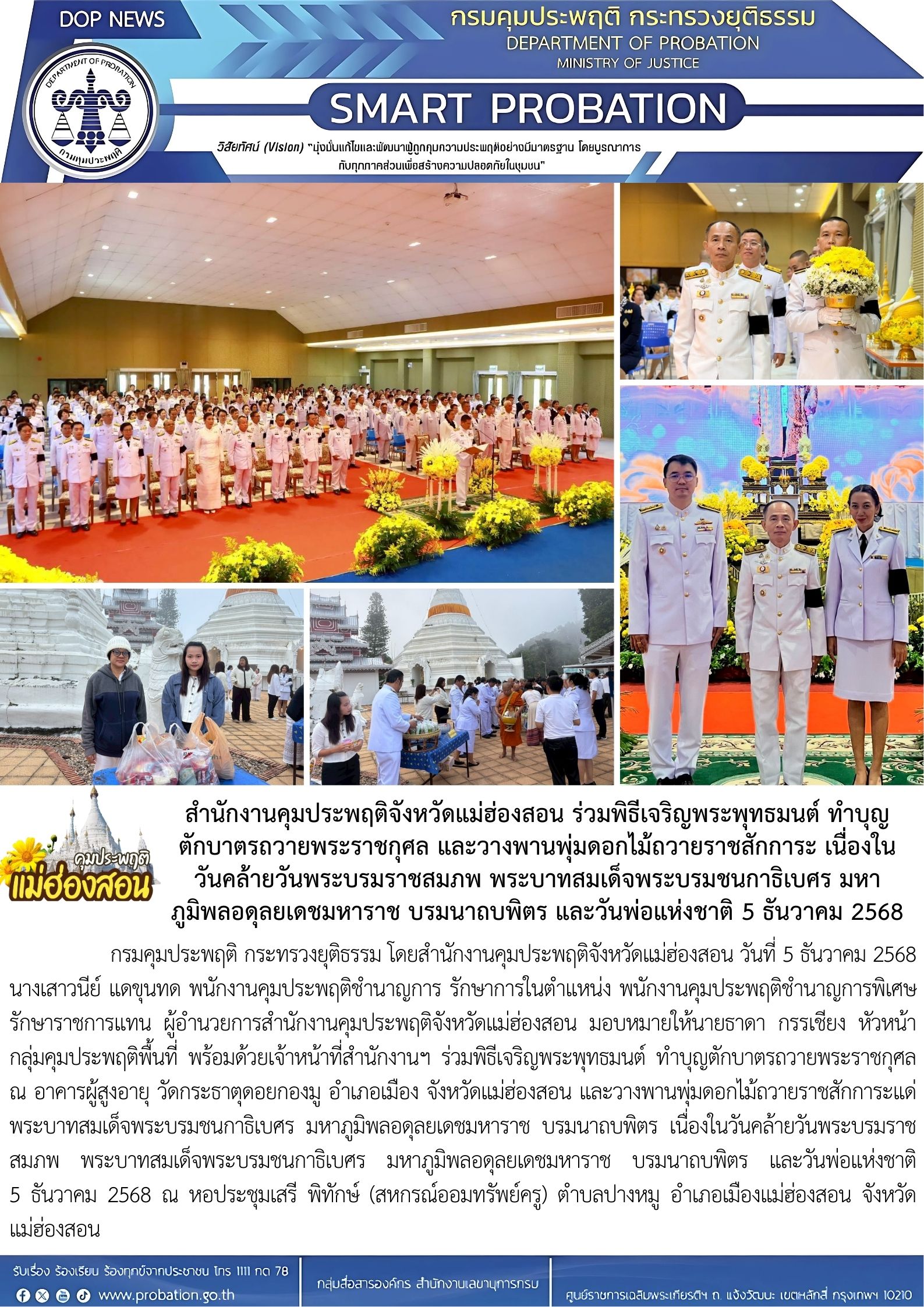 กรมคุมประพฤติ กระทรวงยุติธรรม โดยสำนักงานคุมประพฤติจังหวัดแม่ฮ่องสอน วันที่ 5 ธันวาคม 2568 นางเสาวนีย์ แดขุนทด พนักงานคุมประพฤติชำนาญการ รักษาการในตำแหน่ง พนักงานคุมประพฤติชำนาญการพิเศษ รักษาราชการแทน ผู้อำนวยการสำนักงานคุมประพฤติจังหวัดแม่ฮ่องสอน มอบหมายให้นายธาดา กรรเชียง หัวหน้ากลุ่มคุมประพฤติพื้นที่ พร้อมด้วยเจ้าหน้าที่สำนักงานฯ ร่วมพิธีเจริญพระพุทธมนต์ ทำบุญตักบาตรถวายพระราชกุศล ณ อาคารผู้สูงอายุ วัดกระธาตุดอยกองมู อำเภอเมือง จังหวัดแม่ฮ่องสอน และวางพานพุ่มดอกไม้ถวายราชสักการะแด่พระบาทสมเด็จพระบรมชนกาธิเบศร มหาภูมิพลอดุลยเดชมหาราช บรมนาถบพิตร เนื่องในวันคล้ายวันพระบรมราชสมภพ พระบาทสมเด็จพระบรมชนกาธิเบศร มหาภูมิพลอดุลยเดชมหาราช บรมนาถบพิตร และวันพ่อแห่งชาติ 5 ธันวาคม 2568 ณ หอประชุมเสรี พิทักษ์ (สหกรณ์ออมทรัพย์ครู) ตำบลปางหมู อำเภอเมืองแม่ฮ่องสอน จังหวัดแม่ฮ่องสอน