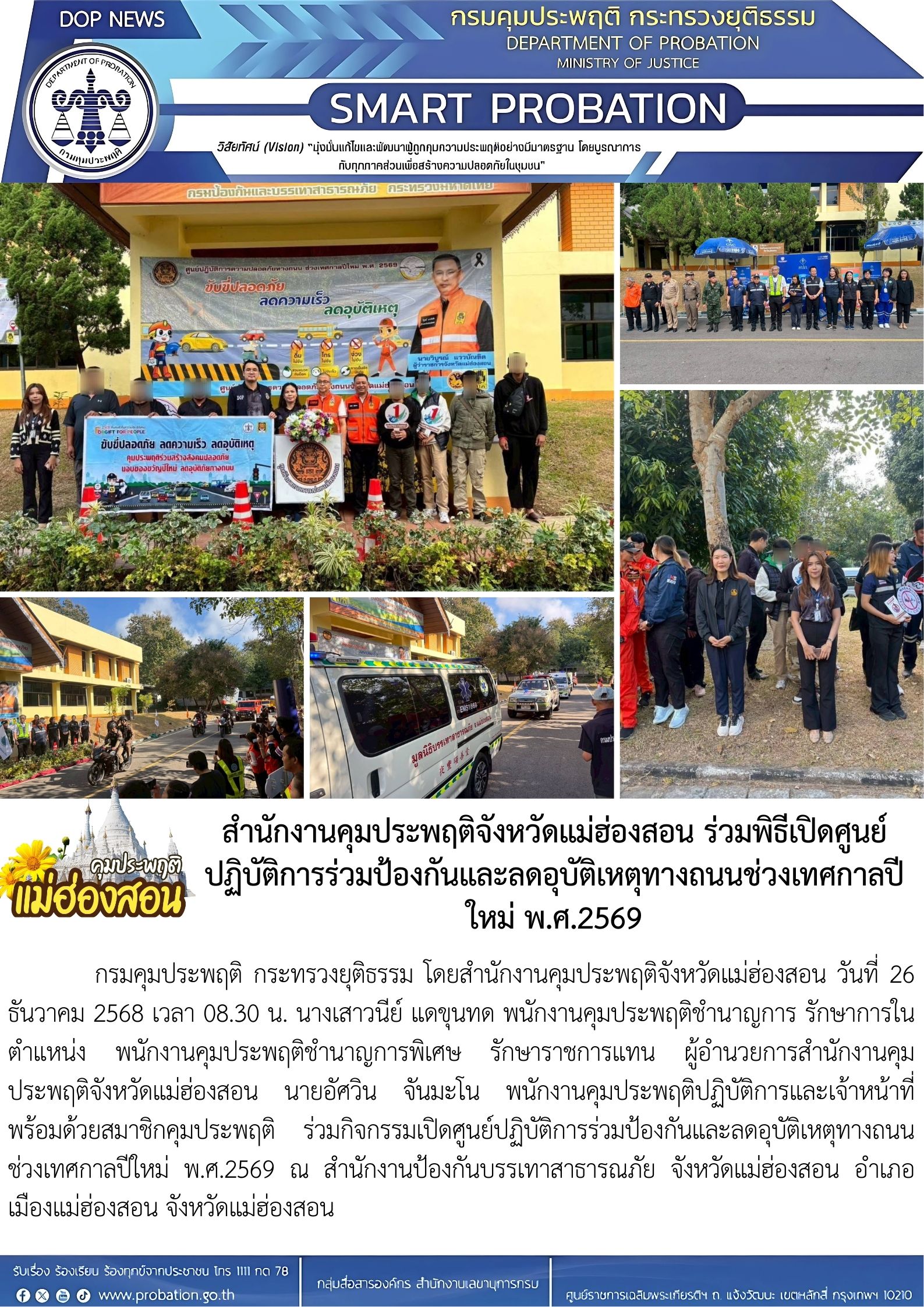 กรมคุมประพฤติ กระทรวงยุติธรรม โดยสำนักงานคุมประพฤติจังหวัดแม่ฮ่องสอน วันที่ 26 ธันวาคม 2568 เวลา 08.30 น. นางเสาวนีย์ แดขุนทด พนักงานคุมประพฤติชำนาญการ รักษาการในตำแหน่ง พนักงานคุมประพฤติชำนาญการพิเศษ รักษาราชการแทน ผู้อำนวยการสำนักงานคุมประพฤติจังหวัดแม่ฮ่องสอน นายอัศวิน จันมะโน พนักงานคุมประพฤติปฏิบัติการและเจ้าหน้าที่ พร้อมด้วยสมาชิกคุมประพฤติ ร่วมกิจกรรมเปิดศูนย์ปฏิบัติการร่วมป้องกันและลดอุบัติเหตุทางถนนช่วงเทศกาลปีใหม่ พ.ศ.2569 ณ สำนักงานป้องกันบรรเทาสาธารณภัย จังหวัดแม่ฮ่องสอน อำเภอเมืองแม่ฮ่องสอน จังหวัดแม่ฮ่องสอน